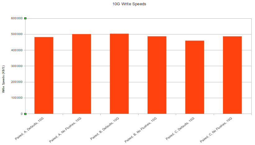 Here I’m comparing paired DRBD configurations with a 1g Ethernet crossover versus a 10g Ethernet crossover. As mentioned before, no matter what your connection is, the read speed is the same. You could have a 16mb Token Ring adapter between the two servers and the read speed would be the same. It is the write speed that changes. Here the 10g Ethernet gives us a tangible speed increase. For about $1.5k (at the time of this writing) you can throw in 2X 10g cards and a copper crossover and get the full potential write speeds out of your disks. Now, of course if these servers are only connected to client computers via 1g and not much disk IO happens on the server itself, this upgrade may not pass the cost/benefit test. But it is good to know what it would be like if you did take the 10g plunge.