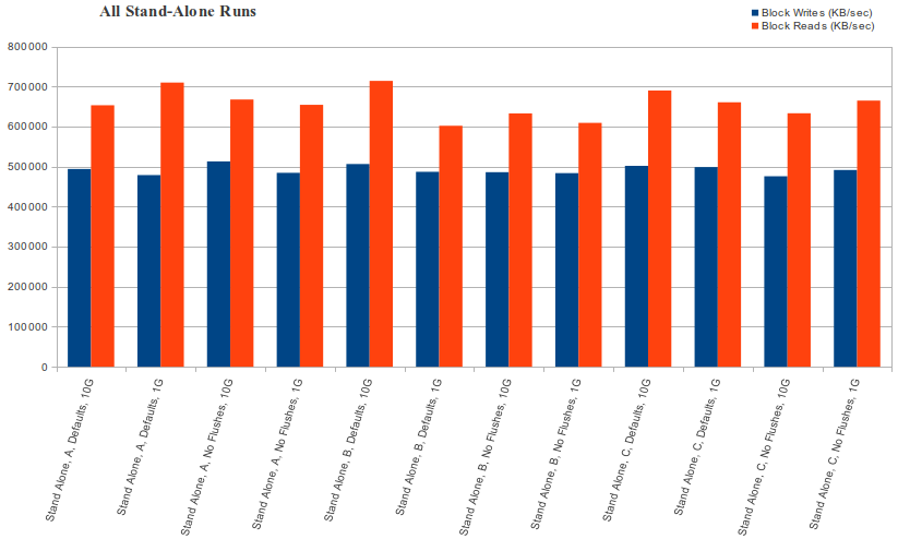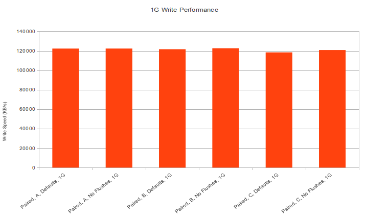 Regarding flushes, with my particular raid card with a BBU, the raid card basically lies to Linux when it asks to do a flush anyway. This is because it is “OK” for the 3ware card has a battery on its cache, so it is “safe”. If I didn’t have a battery or if it was faulty these charts would probably look different. (Maybe my next blog post) In other situations where a battery-backed raid card is not in use, disabling the flushes would bring the write speeds up to this level, but at a cost of a risk of losing data upon a power loss. (serious data, see http://www.drbd.org/users-guide/s-disable-flushes.html for more info). The bottom line here is that you should not disable flushes. Let Linux and your Raid card make the right decision for you.